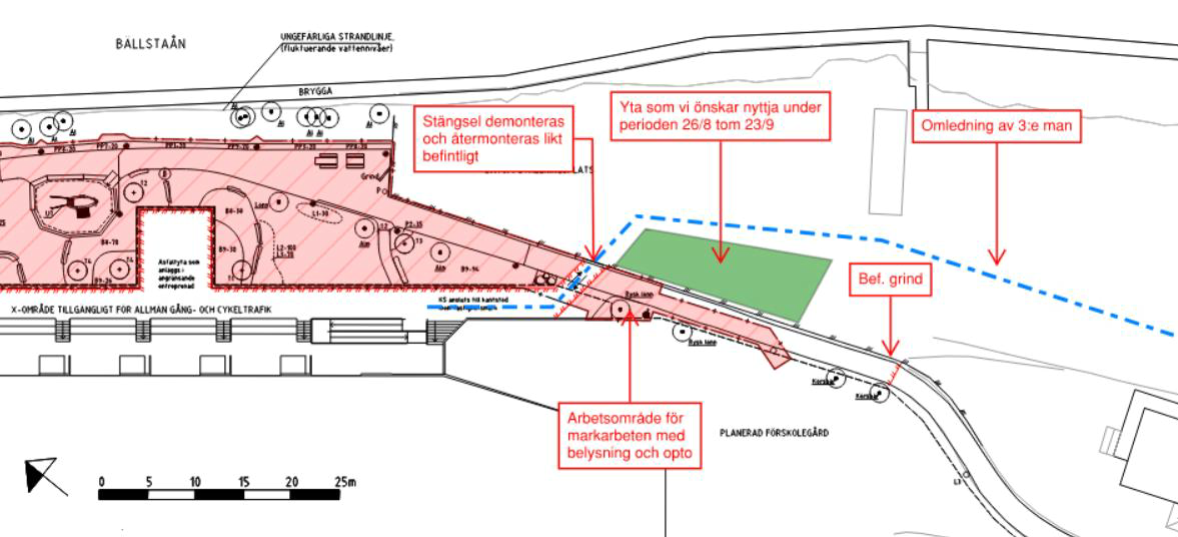 Under tiden arbetet sker kommer Marbit AB ha en byggbod tillfälligt placerad på klubbens mark utefter staketet mitt emot verkstaden, arbetsfordon kommer finnas på det gröna området samt att de som arbetar på plats kommer tillfälligtvis parkera 2-3 bilar på hamnplan under arbetstid. Arbetet beräknas vara klart i slutet av september och den tillfälliga öppningen i staketet mm återställs.