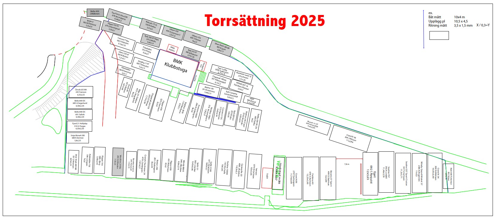 Ställ ut ditt pallmaterial/trailer i närheten vart din båt skall stå placerad enligt bifogad skiss så snart som möjligt.